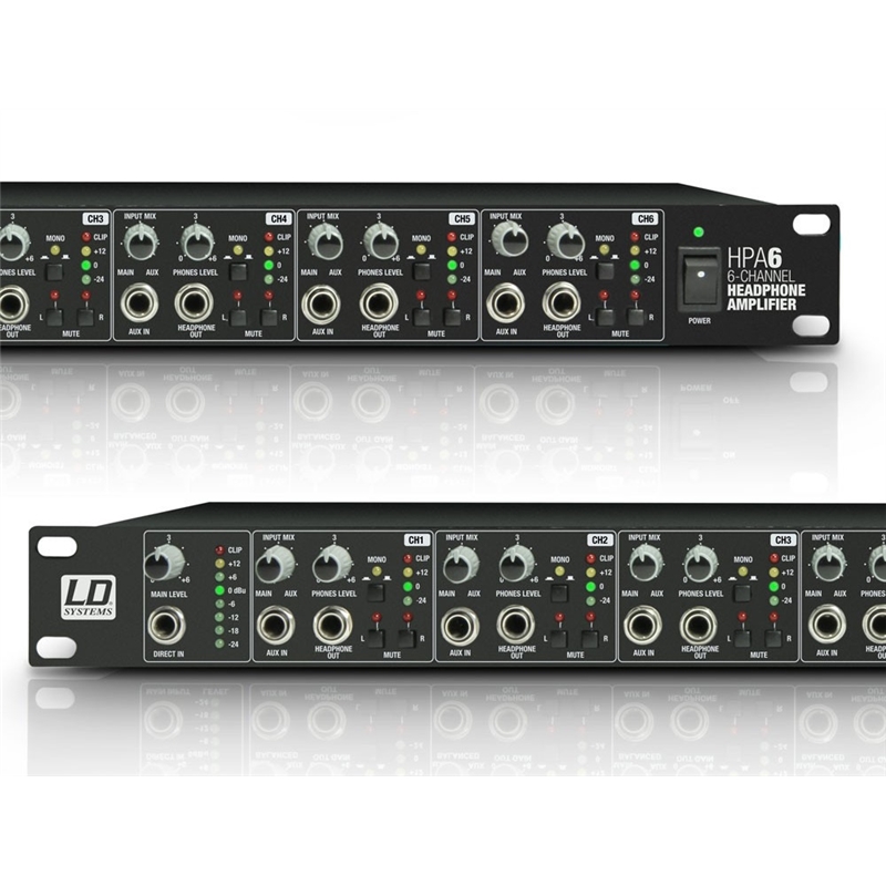 Amplificador de auscultadores de montagem em rack de 6 canais LDHPA6. O LD Systems HPA 6 é um amplificador de auscultadores em formato rack 1U 19” altamente flexível com 6 canais totalmente independentes e recursos abrangentes para uma ampla gama de aplicações de monitorização de áudio profissional.