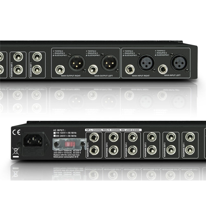 Cada canal fornece uma saída de auscultadores TRS de 6,3 mm no painel frontal com controle de nível, comutação mono/stereo, muting esquerdo/direito discreto e uma entrada TRS Aux de 6,3 mm com controle de equilíbrio principal/aux para mistura em outras fontes de sinal. Medidores LED de quatro segmentos permitem monitorização visual do nível de saída e duas saídas TRS de 6,3 mm por canal na parte traseira permitem conectar um total de 18 auscultadores.