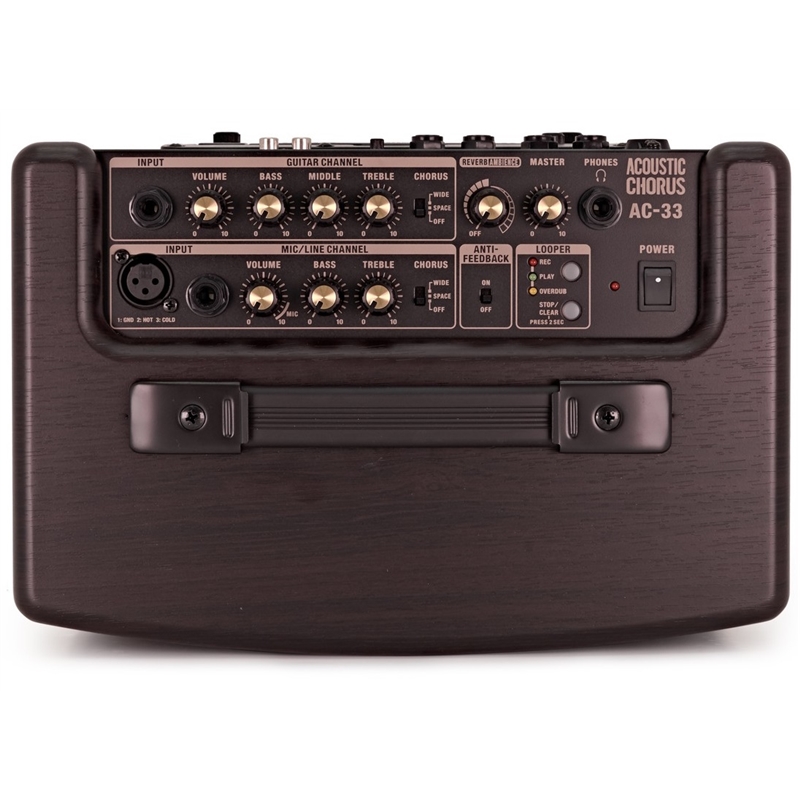 O AC-33 fornece dois canais distintos: Guitarra e Microfone / Linha. Conecte uma guitarra e um microfone (ou instrumento de nível de linha) e misture-os separadamente. Ambos os canais possuem controles dedicados para volume, EQ multibanda e refrão. O canal de microfone / linha oferece entradas XLR e 1/4 ". Você também pode conectar um MP3 / CD player à entrada AUX estéreo para prática ou apresentação de play-along. São fornecidos volume principal, reverb, ambiente e anti-feedback também.