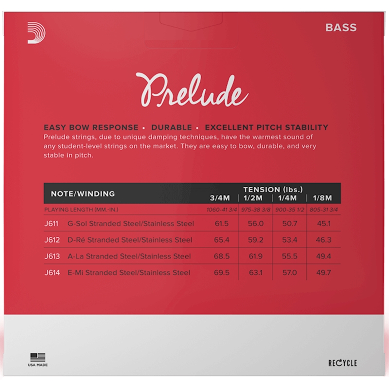 As cordas para contrabaixo Daddario Prelude são cordas de núcleo de aço com vários fios que produzem uma qualidade de tom quente com uma boa resposta ao arco. O design especial do núcleo e a tensão reduzida proporcionam cordas muito fáceis de tocar, especialmente para músicos mais jovens e em desenvolvimento.