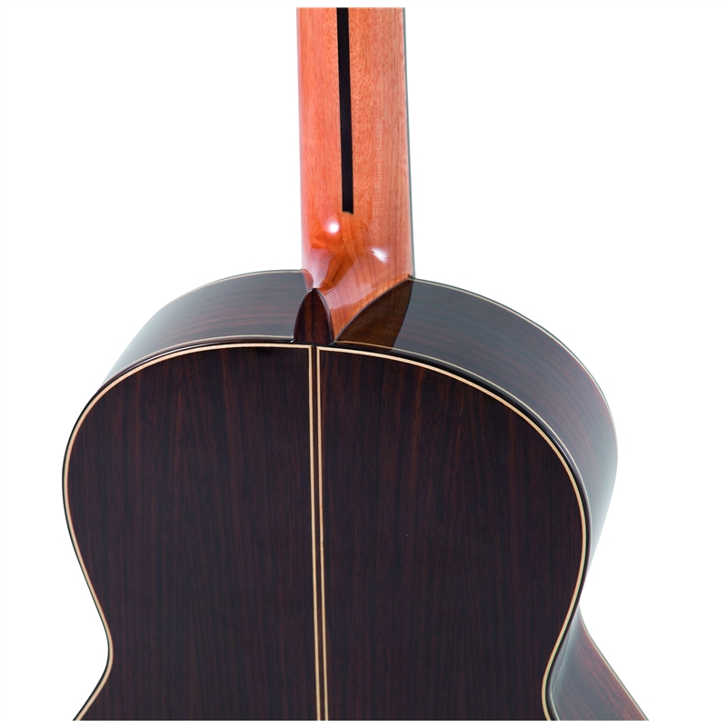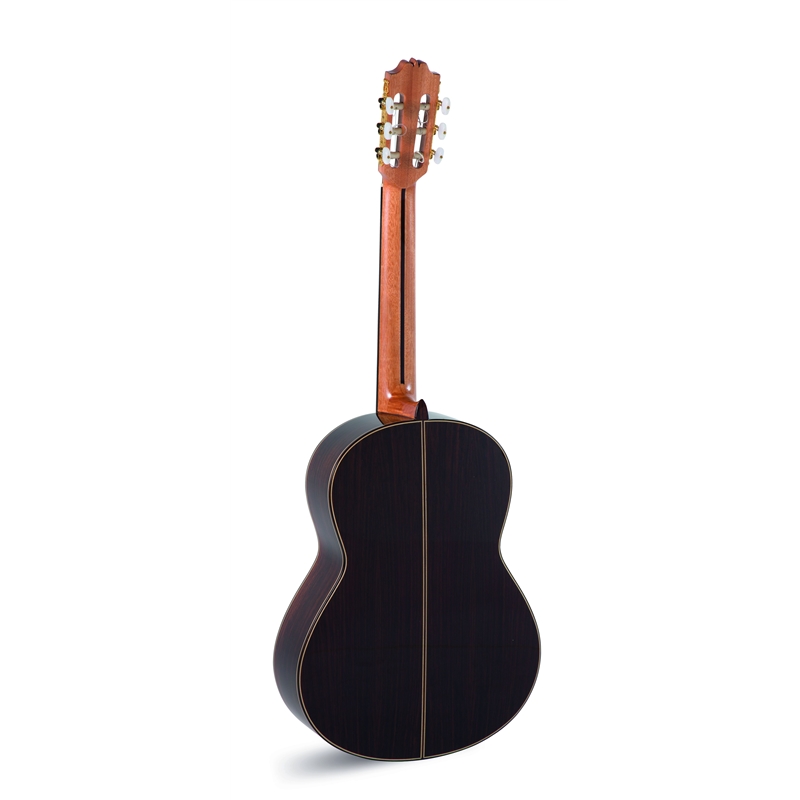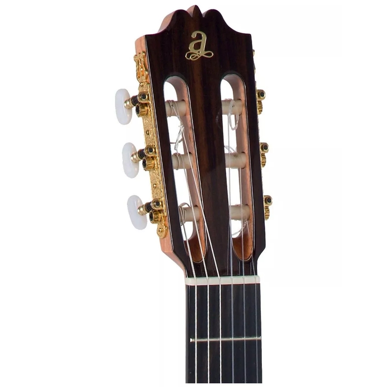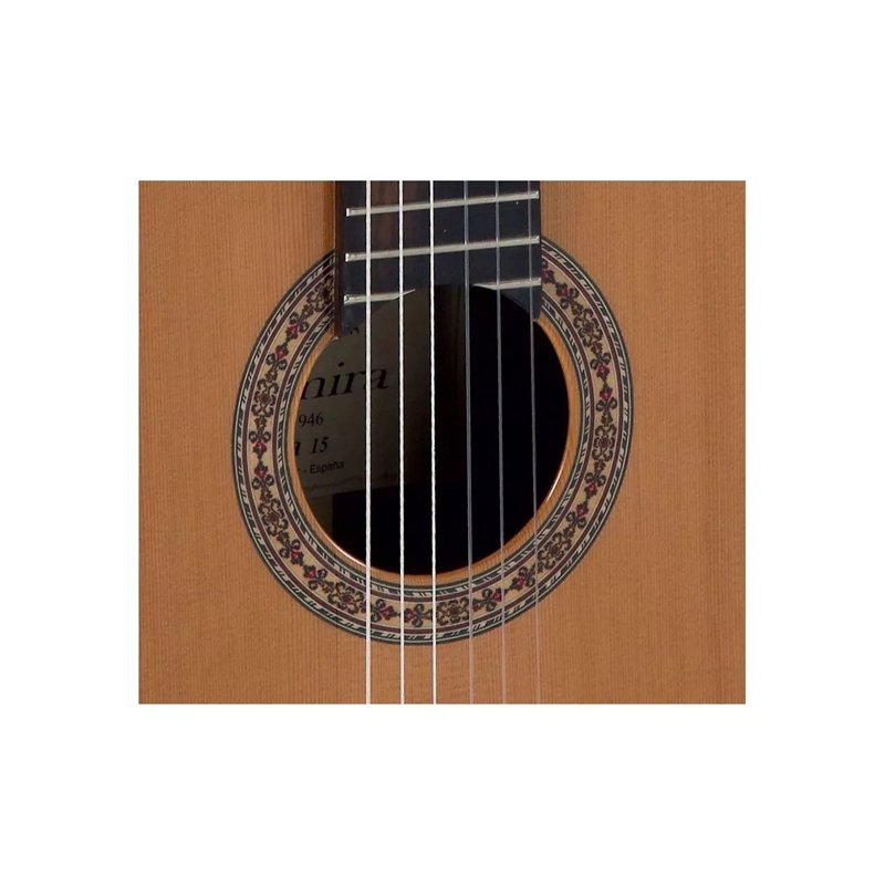 A guitarra clássica Admira A15 é feita à mão em Espanha usando métodos artesanais tradicionais de antigamente. Cedro e jacarandá selecionados foram cuidadosamente escolhidos pelos mestres luthiers da Admira para este modelo: a combinação dessas duas madeiras de alta qualidade produz um timbre muito mais cheio. Na A15, a Admira conseguiu produzir um modelo que combina um som excepcionalmente bom com grande conforto e tocabilidade. A Admira A15 foi feita com um "calcanhar espanhol". Este sistema de montagem garante alta estabilidade, maior volume e maior sustentação. É um método de construção consideravelmente mais demorado do que técnicas mais simples, como colagem, mas os benefícios sonoros são inigualáveis. A guitarra Admira A15 apresenta um tampo de cedro sólido, laterais e costas de jacarandá indiano, braço de mogno com faixa de reforço de ébano, escala de ébano, afinadores dourados de luxo, cordas Savarez AJ500 e acabamento brilhante. Uma pechincha pelo preço.