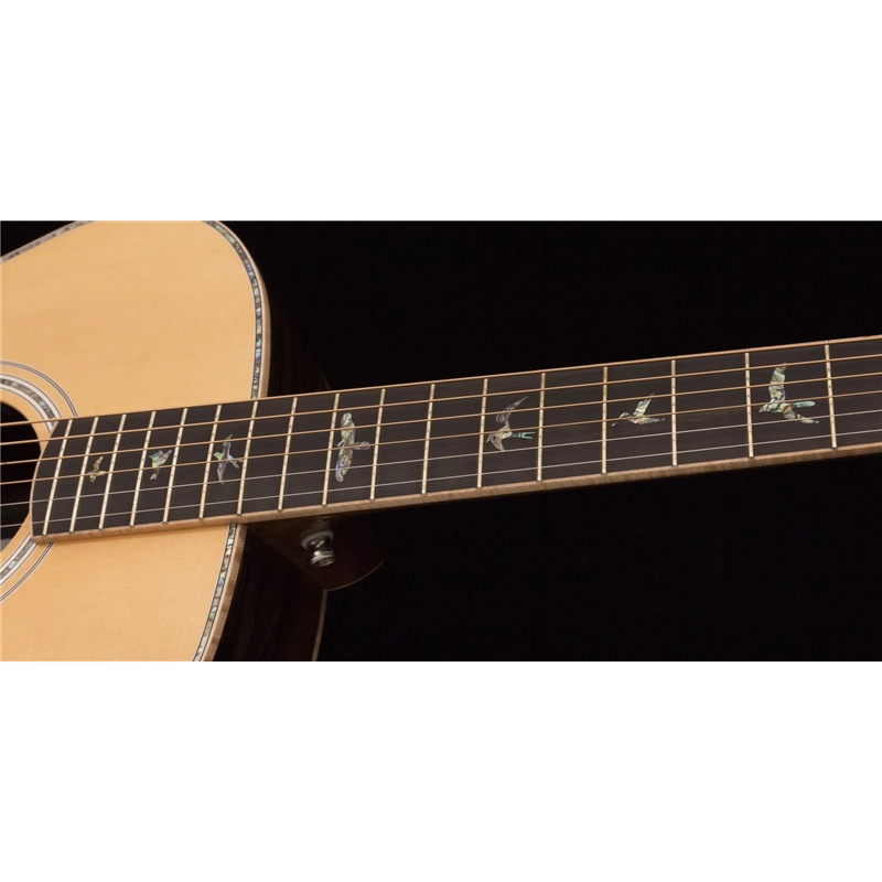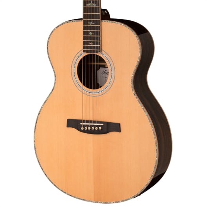 A SE T60E é lindamente decorado com detalhes em abalone e maple figurado. Recursos adicionais de alta qualidade incluem um tampo de abeto sólido, escala e ponte de ébano, porca e sela de osso, bem como incrustações de pássaros da marca PRS e design de cabeça. É fornecido com um case rígido de alta qualidade.