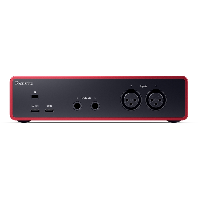 2x entrada de instrumento / linha jack de 6,3 mm, 2x entrada de microfone XLR, 2x saída de linha jack de 6,3 mm balanceada, saída de auscultadores stereo jack de 6,3 mm, conexão USB-C para PC / Mac, conexão USB-C para fonte de alimentação externa de 5V 5V @ 1000mA (não incluída)