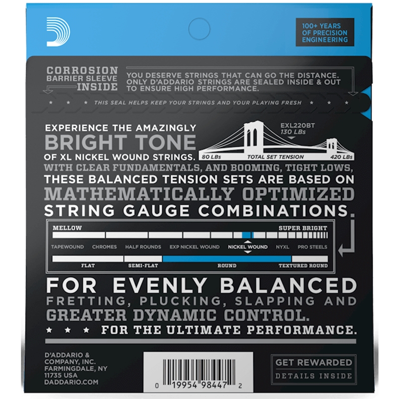 O EXL220BT é um jogo de cordas para baixo eletrico de tensão balanceada que oferece mais flexibilidade, mantendo o tom fundamental. As cordas de baixo elétrico XL Nickel Wound, há muito reconhecidas como o padrão da indústria, são ideais para uma ampla variedade de estilos musicais.