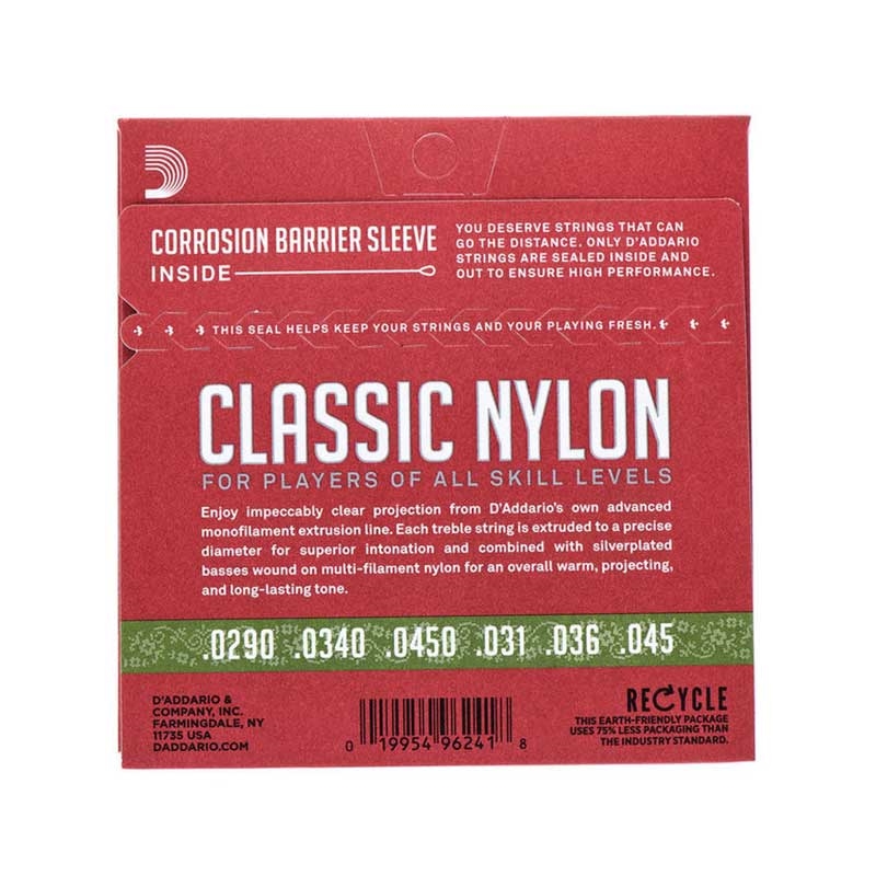 As cordas de guitarra EJ27N 1/2 Classic Nylon da D'Addario são óptimas para iniciantes, estudantes e profissionais. Este conjunto de tensão Normal contém 3 cordas em nylon transparente e 3 com enrolamento em cobre banhadas a prata para o equilíbrio ideal de tons quentes e projectados de longa duração.