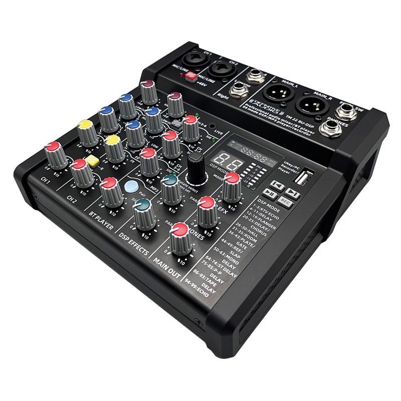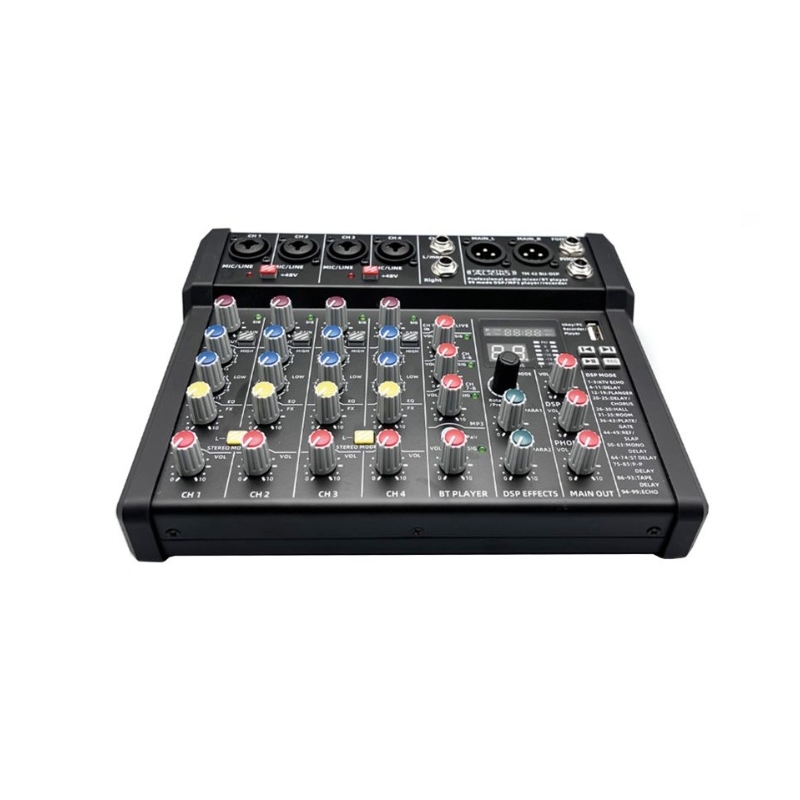 A TM 42 BU-USB é uma mesa de mistura analógica de 7 canais, com 4 entradas combinadas XLR/Jack 6,35 mm e uma entrada AUX estéreo de 3,5 mm. Também possui um recetor Bluetooth e um gravador/leitor USB. Os pré-amplificadores de microfone são da mais elevada qualidade, pelo que pode ter a certeza de um desempenho sem falhas. Está equipado com um multi-efeitos digital com 99 predefinições, incluindo os principais efeitos necessários para uma utilização clássica.