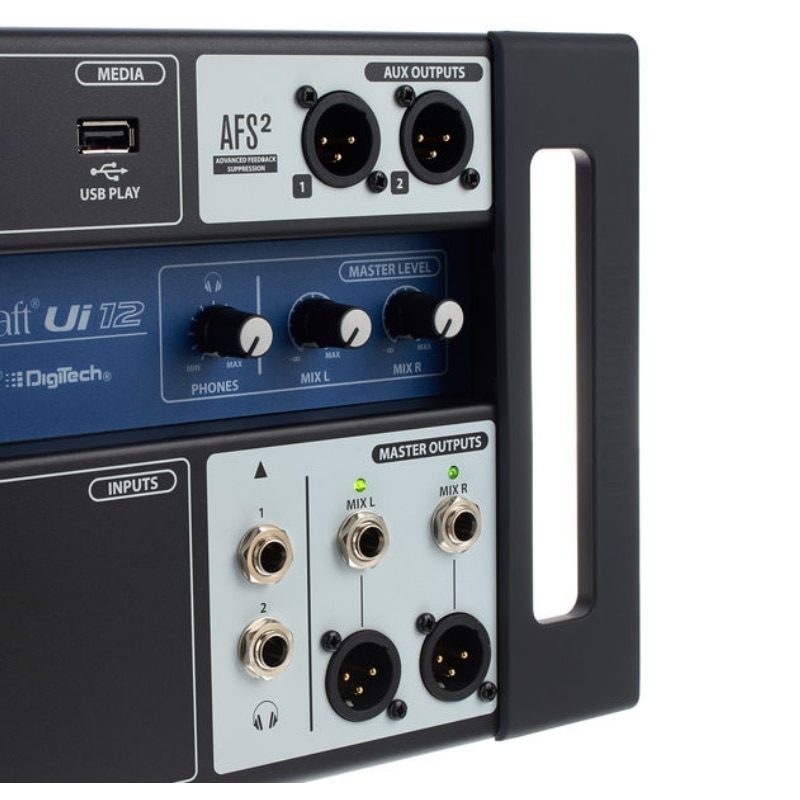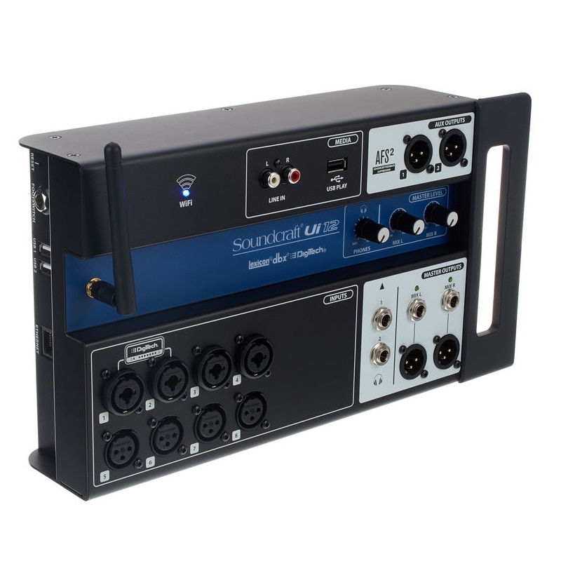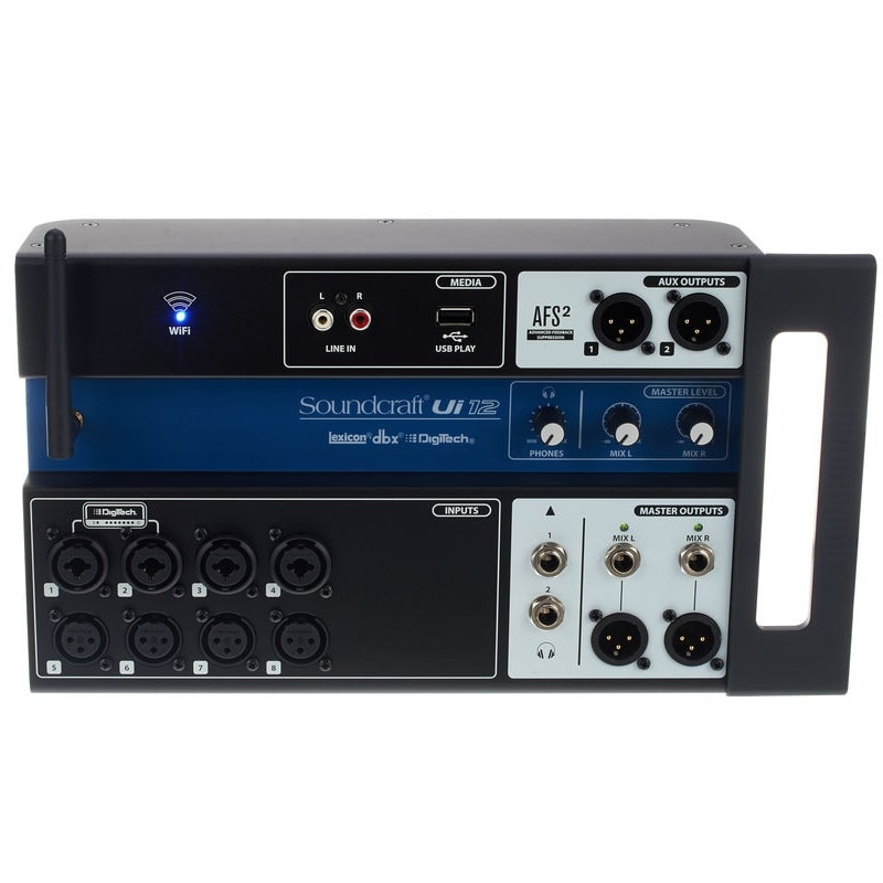 Mesa de mistura digital de 12 canais com controlo para tablet/smartphone/PC. Com ligação interna WiFi. O Soundcraft Ui12 fornece a edição profissional do som com efeitos de Lexicon, modelagem do amplificador de Digitech e supressão de feedback da dbx. O analisador em tempo real de 120 bandas permite um melhor controlo da mistura.