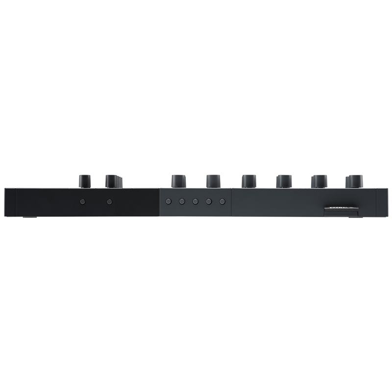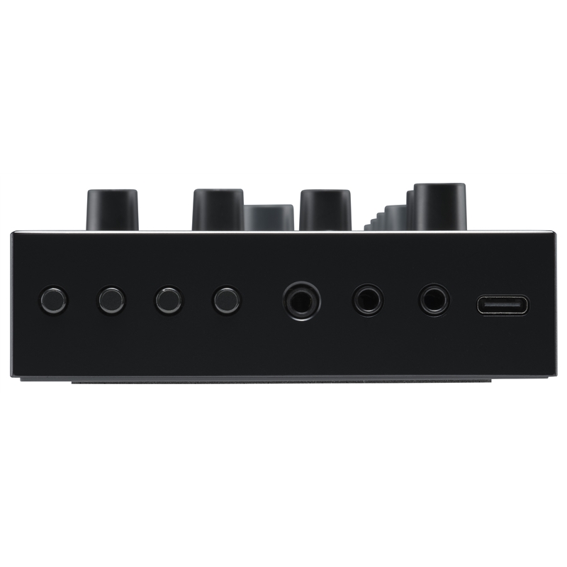 Conexões: entrada AUX stereo mini-jack de 3,5 mm, saída de auscultadores stereo mini-jack de 3,5 mm, entrada e saída MIDI mini-jack de 3,5 mm, USB-C (áudio/MIDI/fonte de alimentação)