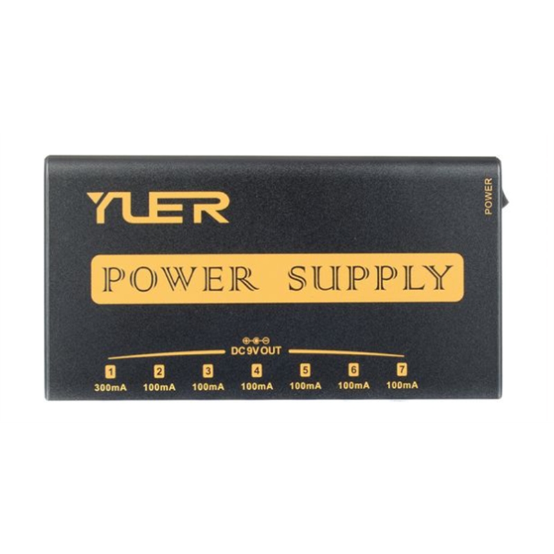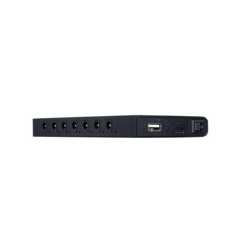 6 saídas de 9 V CC, carregáveis ??com 100 mA cada, ficha oca de 2,1 x 5,5 mm, polaridade (-) interna